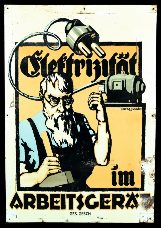 Wie verkauft man Strom? Nicht zu schmecken, nicht zu riechen, nicht greifbar. Aber sehr wohl in seiner Wirkung das Leben erleichternd. Mit diesem Gedanken traten die Vereinigung der Elektrizitätswerke (VdeW) an Fritz Julian heran, der 1926 für eine große Werbekampagne das Design lieferte – Elektrizität in jedem Gerät. Der Stecker als Tor zu einem neuen Zeitalter findet dabei auf all seinen Entwürfen Anklang.