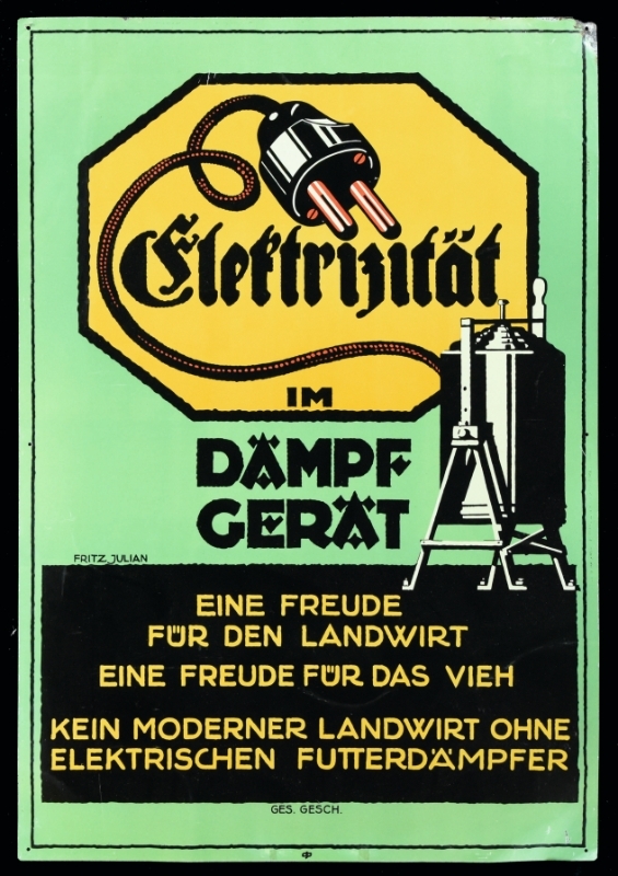 Wie verkauft man Strom? Nicht zu schmecken, nicht zu riechen, nicht greifbar. Aber sehr wohl in seiner Wirkung das Leben erleichternd. Mit diesem Gedanken traten die Vereinigung der Elektrizitätswerke (VdeW) an Fritz Julian heran, der 1926 für eine große Werbekampagne das Design lieferte – Elektrizität in jedem Gerät. Der Stecker als Tor zu einem neuen Zeitalter findet dabei auf all seinen Entwürfen Anklang.