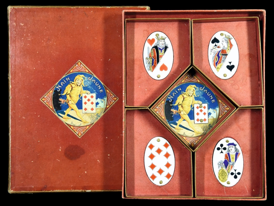 Neben der Reklame gab es vielerlei Alltags- und Kunstgegenstände, bei denen man auf die Kunst des Emaillierens zurückgriff. So auch bei dieser frühen französischen Kartenspielbox mit dem Namen "Der gelbe Narr" (frz. Nain Jaune), bei welcher die Fächer mit fünf verschiedenen Emailschildchen versehen wurden, um die Kartenfarbe anzuzeigen. Gibt es ein eleganteres Objekt, in dem man heutzutage das Kartendeck bis zum nächsten Skatabend aufbewahren kann? Mitnichten!