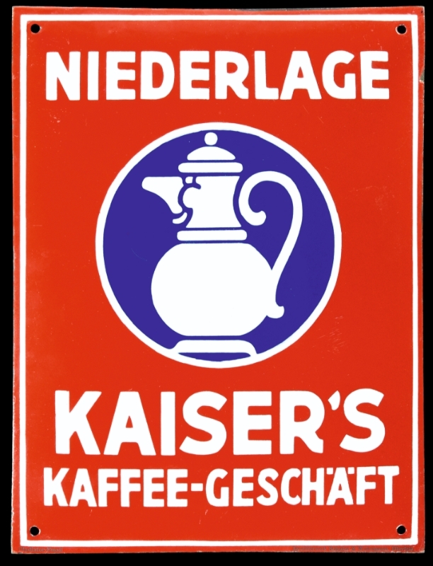 Die Kaiser's Kaffee Geschäft AG gründete sich als Kolonialwarenladen 1881 in Viersen. Wie üblich zu Ende des 19. Jahrhunderts lag der Großteils des Verdienstes im Hausieren, dem Ausfahren der Ware mittels Karren. Heute würde man von einem mobilen Verkaufsstand sprechen. Der große Coup gelang Joseph Kaiser durch die Entwicklung einer Gerätschaft zum Brennen von Kaffeebohnen, mit der er das zum Luxus gewordenen Gut für das breite Bürgertum wieder zugänglich machte. Der Start einer großen Erfolgsgeschichte - in zahlreichen Filialen wurde das heute weit verbreitete Konzept, Standardware in einem überschaulichem Sortiment zu günstigen Preisen anzubieten, umgesetzt. Im Jahre 1900 gab es so bereits deutschlandweit über 500 Filialen, jede davon plakatiert mit emaillierter Außenreklame. Umso mehr freut es uns, eines der seltensten Werbeträgern dieser Marke in solch unbeschadetem Zustand gefunden zu haben.