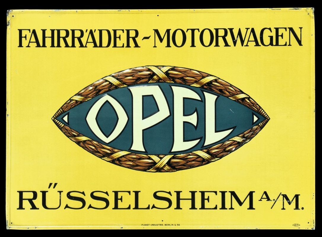 Laut der Legende soll der erste Entwurf für das Opel "Auge" von Großherzog Ernst Ludwig von Hessen bei einem Treffen mit Wilhelm Opel spontan entstanden sein. Opel fand daran Gefallen und so verwandte man dieses als Logo bis 1935 in verschiedensten Varianten. Die auf diesem Blech geprägte Version dessen lässt sich auf die Zeit von 1910 bis 1924 einordnen. Das kleine Monogramm im rechten unteren Eck verrät: für die Ausarbeitung des Logos in dieser Form wurde ein Grafiker engagiert. Ein geschichtsträchtiges Exemplar, das einst in den Archiven der Plakatindustrie in Berlin gefunden wurde. In dieser Erhaltung gilt es als das best bekannte Exemplar.