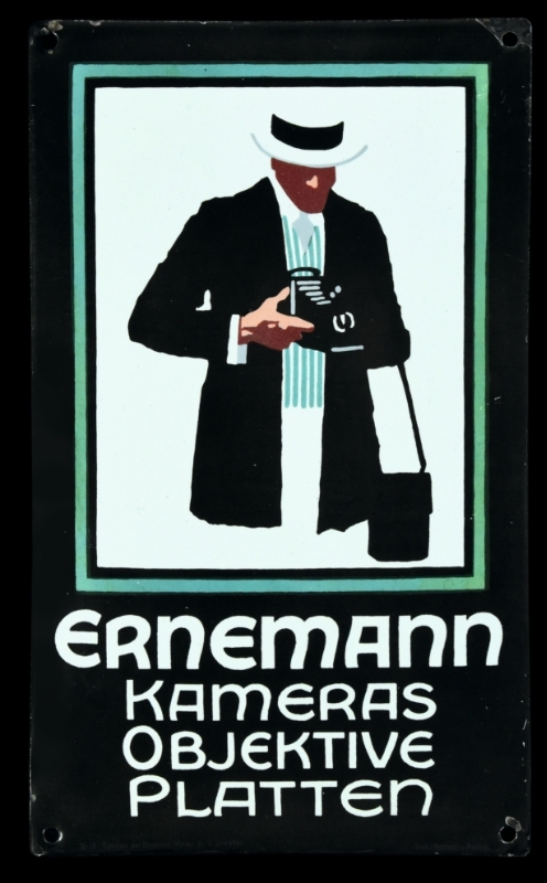 Ludwig Hohlwein (1874–1955) ist besonders für seine klaren, ausdrucksstarken Entwürfe bekannt, die gerade in emaillierter Form die Sammlerherzen höher schlagen lässt. Sein markanter, reduzierten Stil, der oft kräftige Farbkontraste und einfache Formen lässt sich auch hier zweifelsfrei wiedererkennen. Der weiße, mit dem Hintergrund verschmelzende Hut wirf einen Schatten in das Gesicht des Herren. Ein edles Stück früher Reklame, die dem Dresdner Kameraherstellers ein kleines Denkmal setzte. Der Entwurf zählt zweifelsfrei zu den Ikonen deutscher Reklame.