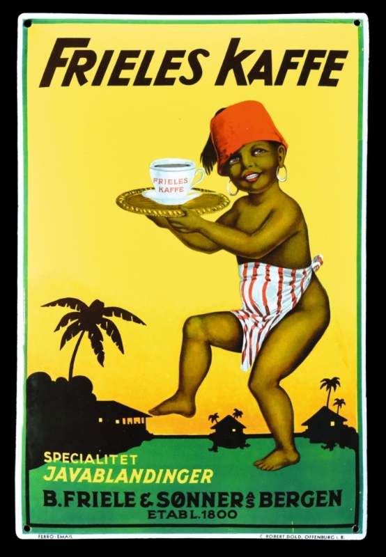 Man stelle sich vor: Die raue Briese an Norwegens Küste und in der Ferne ein Tee- beziehungsweise Kaffeehaus, das dieses Emailschild ziert. Es muss faszinierend gewesen sein, ein solch exotisches Motiv aus unerreichbaren Ländern zu betrachten. Der kleine Junge tänzelt vor den Palmen mit dem Frieles Kaffe einladend hin und her. Eine Farbpracht auf Emaille, die sich nachhaltig großer Beliebtheit erfreut.