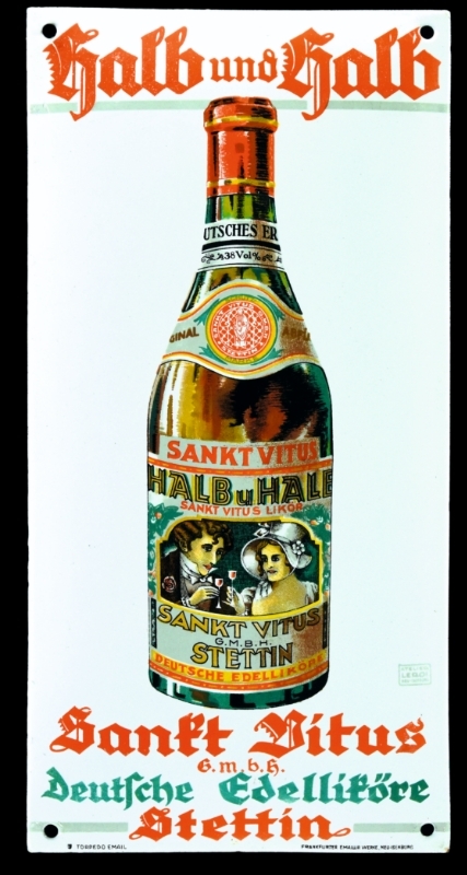 Die Sankt Vitus G.m.b.H. ließ sich ihrerzeit bereits durch das firmeneigene Grafikatelier der Frankfurter Emaillierwerke einen Entwurf für die Bewerbung Ihres Halb und Halb Edelliköres erstellen. Das hiesige Exemplar überzeugt mit einer Farbkraft, die so nur selten zu finden ist.