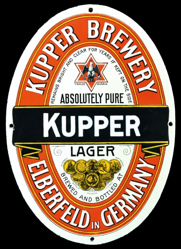 Ein frühes Emailplakat einer Wuppertaler Brauerei, das für den Markt in Übersee hergestellt wurde, in welchen die Brauerei schon früh exportierte. Eben jener Export wurde der Brauerei um 1900 durch eine übermäßige Abhängigkeit vom Auslandsgeschäft zum Verhängnis, weshalb man nach lukrativem Angebot mit einem Konkurenten zur Wicküler-Küpper-Brauerei AG fusionierte. Höchstwahrscheinlich war auch dies der Grund, wieso das Emailschild bis heute noch in Deutschland verweilen durfte.