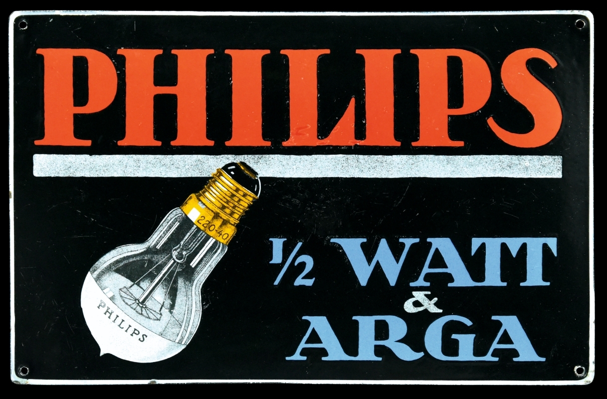 Das Unternehmen Philips & Co. Wurde 1891 im niederländischen Eindhoven gegründet und zählte neben Osram zu den großen Profitören des Aufschwungs der Elektroindustrie. Dieses Emailschild zeigt eines der ersten Produkte. 1915 kommt diese Neuheit, eine mit Argon gefüllte Glühlampe auf den Markt. Das Schutzgas sorgte für eine längere Lebensdauer des Glühfadens und stach so aus der Konkurrenz hervor. Mit dem Slogan „So hell wie die Sonne!“ wirbt das Unternehmen seiner Zeit dafür und legte somit die Grundsteine zum Aufstieg eines heutigen Weltkonzerns.