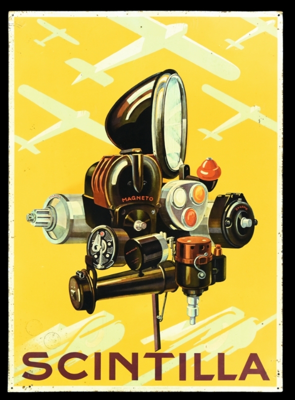 Mit der Entlassung zweier Schweizer Ingenieure bei Bosch im Zuge des 1. Weltkrieges beginnt die Geschichte der Firma Scintilla. Der Name selbst verrät bereits: es geht um den für den Motorenbetrieb unerlässlichen Funken (lat. scintilla). Mit eigenem Patent und massiver finanzieller Unterstützung durch das Elektrotechnik Unternehmen Brown, Boveri & Cie startet der Erfolg der Firma aufbauend auf Magneto-Zündern mit rotierendem Magnet. Nicht zuletzt auch dadurch, dass die Entwicklungsarbeit bei Bosch durch das Kriegsgeschehen stark zurückging. Anfangs nur für die Aviatik ausgelegt, erweiterte man in den 20er Jahren die eigene Produktpalette immer weiter und fasste Fuß in der Automobilindustrie. Einen exklusiven Abnehmer fand man im belgischen Automobilhersteller Minerva, der als erster ausschließlich Scintilla Komponenten verbaute. Nach schwächelnder Wirtschaftlichkeit der Produktion fand man 1925 neue Investoren, die vor allem die den Mehrwert in der Flugzeugindustrie fanden. Und so gelang es, die US Air Force und US Navy als Großabnehmer für die Scintilla Magnetos zu gewinnen. Der US-Markt boomte. Und so wurde man auch Teil des pionierhaften Non-Stop Atlantiküberfluges von Charles Lindbergh im Jahre 1927. Ein Hauch dieser spannenden Geschichte bekommt ein jeder Betrachter dieses Blechschildes vermittelt. Die Produktpalette inmitten einer Flugzeugformation, darunter zwei Wägen scheinbar aus dem Nichts erscheinend. Eine wahre Rarität, die seinerzeit in Belgien hing, wie es sich anhand der beiden eingestempelten Steuermarken entnehmen lässt.