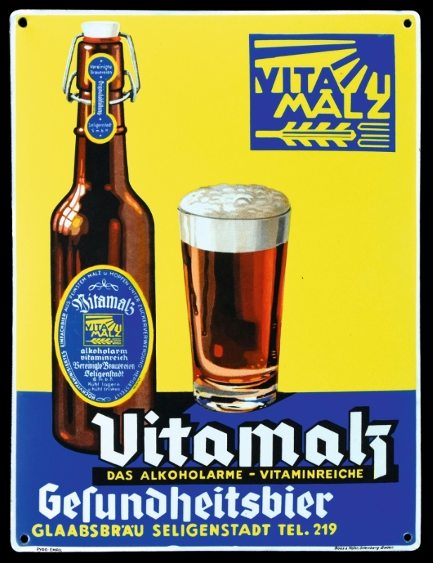 1931 erwarb die Brauerei Glaabsbräu aus Seligenstadt das Patent für Malzbier, welches in einem 1920 entdeckten Brauverfahren hergestellt wurde. Die Patentrechte unterlagen zuvor der Vita Lux-Gesellschaft, die zugleich Namensgeber für das neue Malzbier wurde: Vitamalz. Bis ins Jahre 1970 wurde Vitamalz exklusiv von der Brauerei Glaabsbräu gebraut, bis diese sich mit anderen Getränkeherstellern unter dem Dach einer Vitamalz Gesellschaft zur einheitlichen Produktion zusammenschloss. Jenes Emailschild stammt aus der frühen Brauzeit und lässt sich auf den Beginn der 30er Jahre datieren.